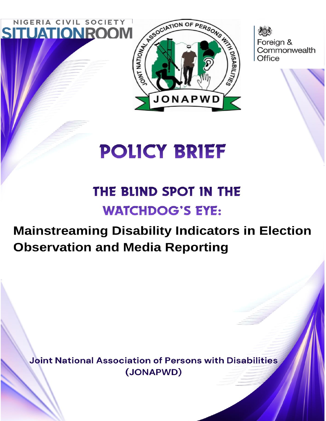 Final Draft_ POLICY BRIEF 3_ the Blindspot in the watchdog’s eye_page-0001 Related PostsAssumptive Data of Persons with Disabilities in NigeriaMarch 11, 2026REPORT: 2024 CONFERENCE OF STAKEHOLDERS ON DISABILITY INCLUSION IN NIGERIA (COSDIN 1.0)October 14, 2025No Provision For Persons With Disabilities, Says INECDecember 3, 2015Independence Message to Nigerians with Disabilities – 65th Anniversary of Nigeria’s Nationhood by the Joint National Association of Persons with Disabilities (JONAPWD)October 1, 2025ACCESSIBILITY AUDIT REPORT OF SEXUAL AND GENDER-BASED VIOLENCE RESPONSE AND REFERRAL CENTERS IN LAGOS AND ABUJAApril 17, 2026