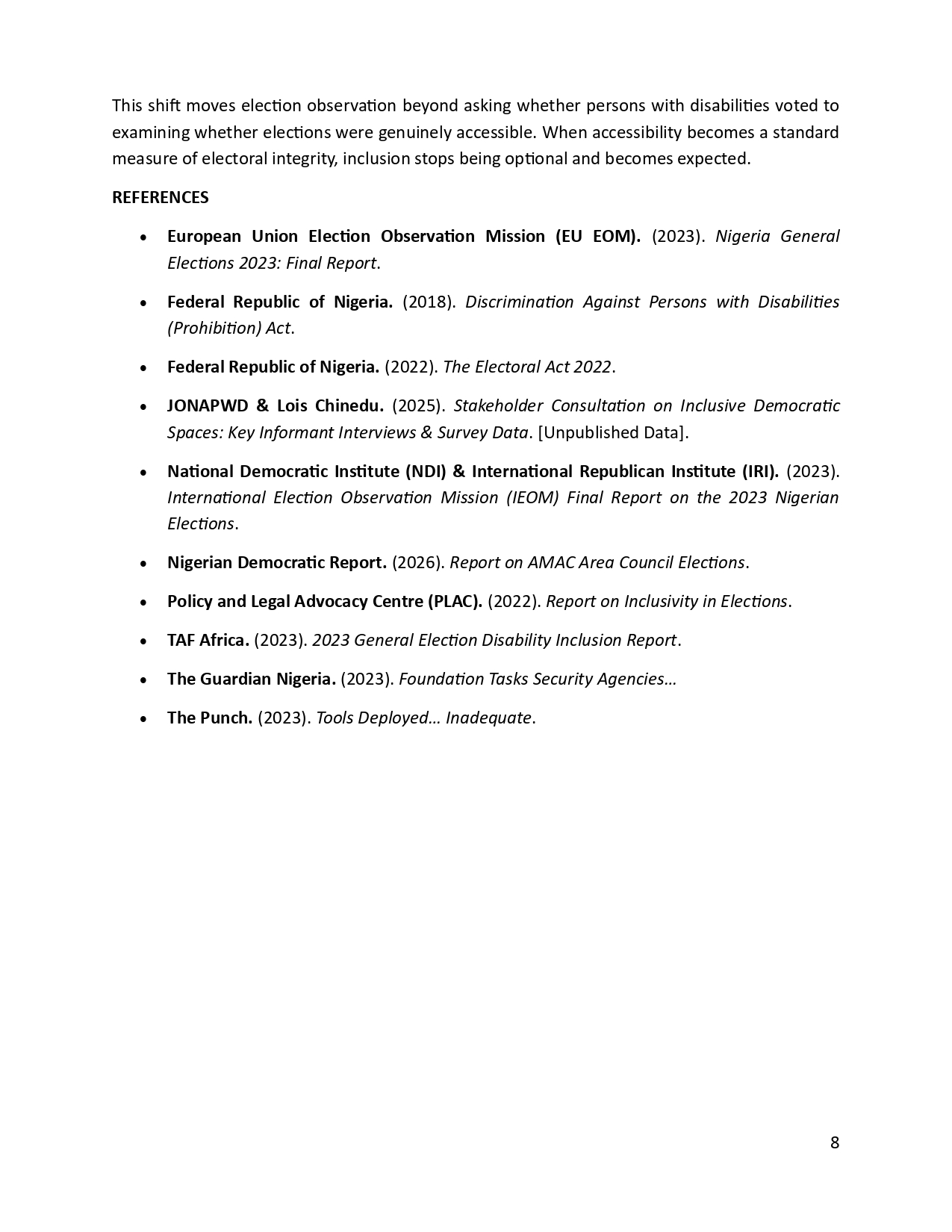 Final Draft_ POLICY BRIEF 3_ the Blindspot in the watchdog’s eye_page-0008 Related PostsAssumptive Data of Persons with Disabilities in NigeriaMarch 11, 2026REPORT: 2024 CONFERENCE OF STAKEHOLDERS ON DISABILITY INCLUSION IN NIGERIA (COSDIN 1.0)October 14, 2025COMMEMORATION MESSAGE FOR THE 2024 INTERNATIONAL DAY OF PERSONS WITH DISABILITIES BY JONAPWDDecember 3, 2024VALIDATION OF VOTERS WITH DISABILITIES IN 2023 GENERAL ELECTIONSNovember 15, 2024Breaking the Glass Ceiling: JONAPWD Unveils Landmark Assumptive Data on Persons with Disabilities in NigeriaMarch 11, 2026